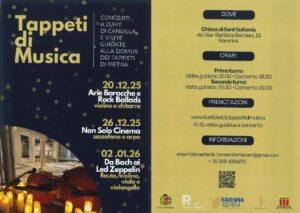 Dal 20 dicembre 2025 al 2 gennaio 2026 la Domus dei Tappeti di pietra ospita TAPPETI DI MUSICA, una serie di concerti a lume di candela organizzati da Ensemble Mariani. I concerti saranno preceduti da una visita guidata alla Domus, che oltre a raccontare l’incredibile scoperta della Domus dei Tappeti di Pietra e la sua musealizzazione, farà riferimento anche agli effetti decorativi e scenografici della luce nel periodo tardo antico. - LUNEDI 8 DICEMBRE 2025: 8^ CAMMINATA DELL’ARTIGIANATO